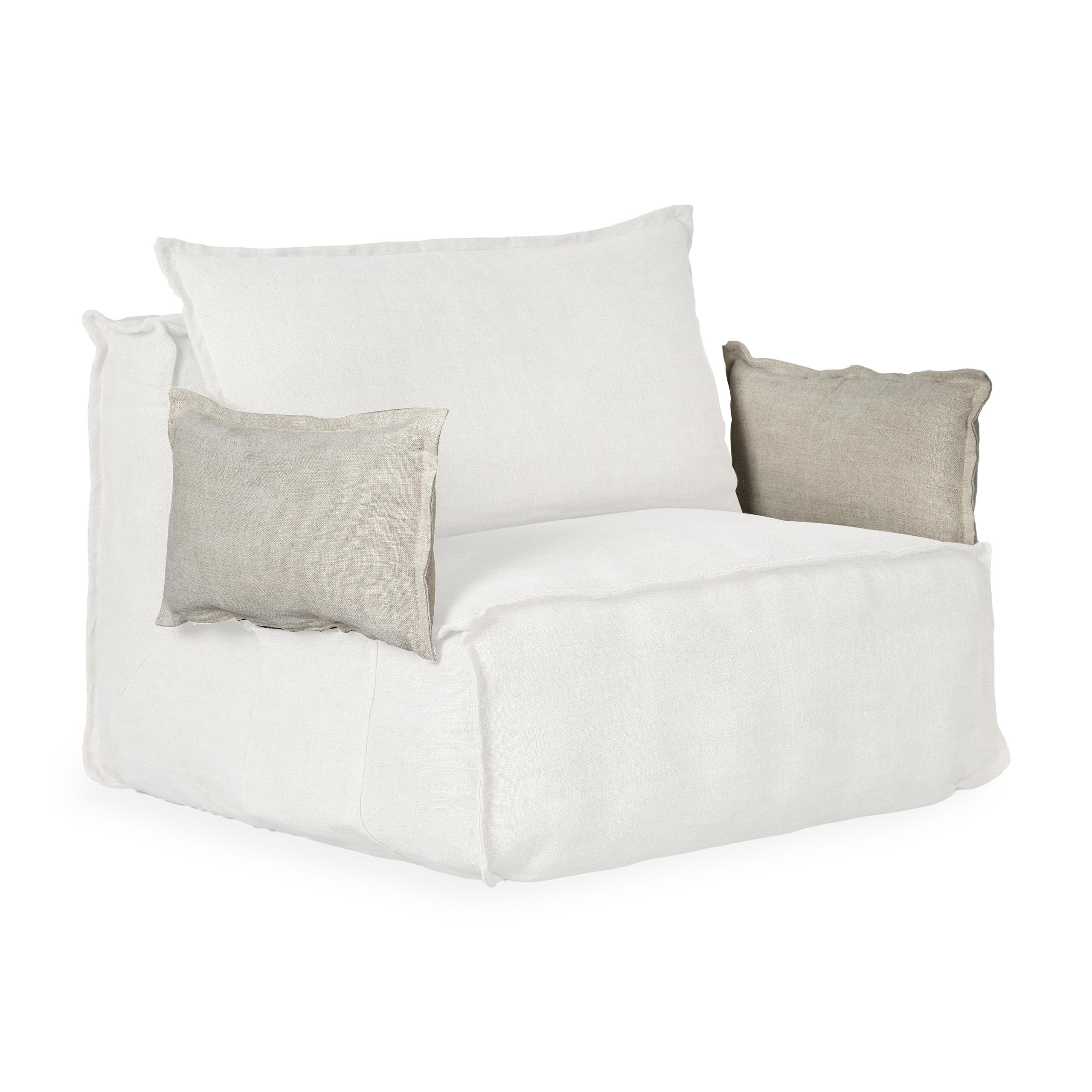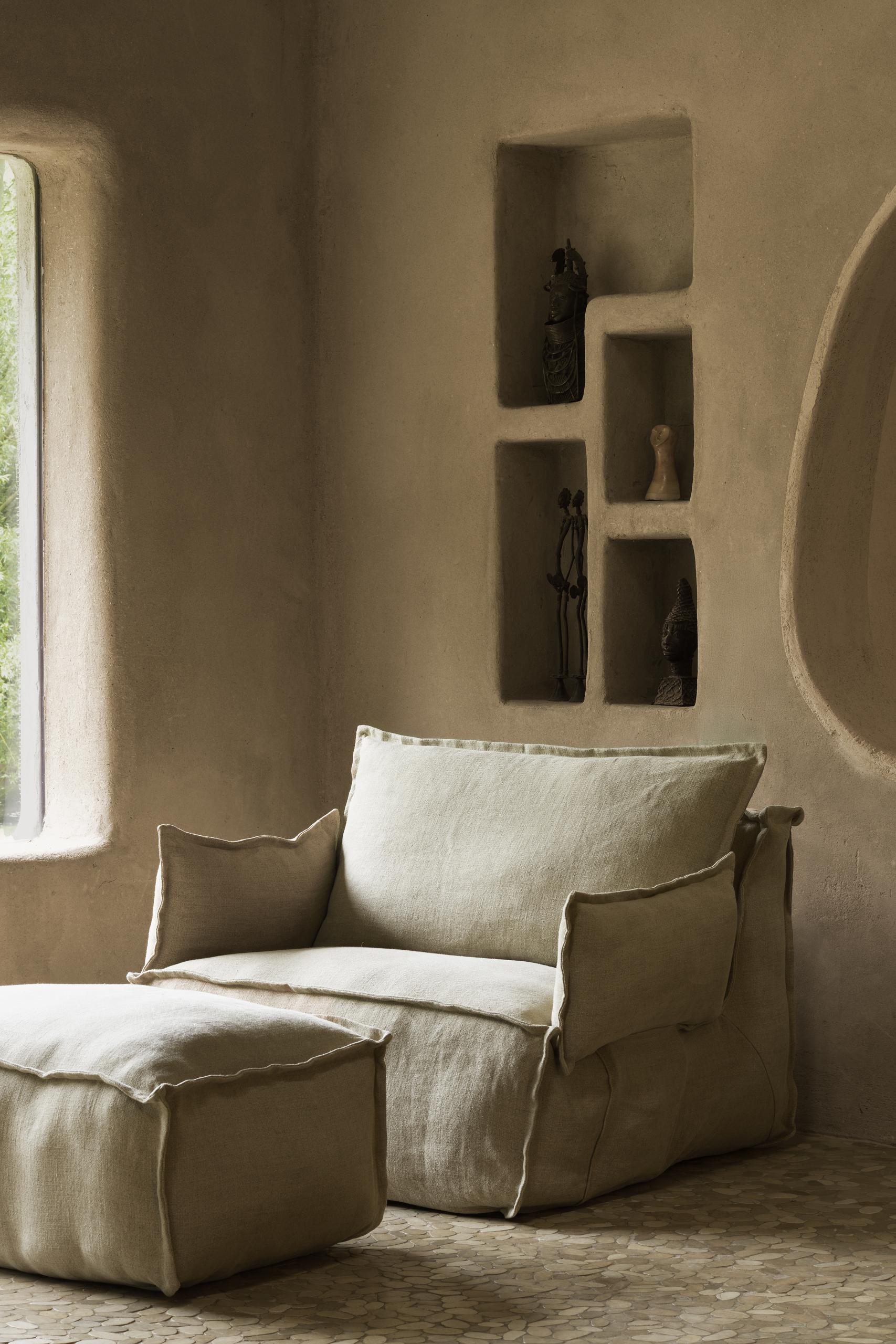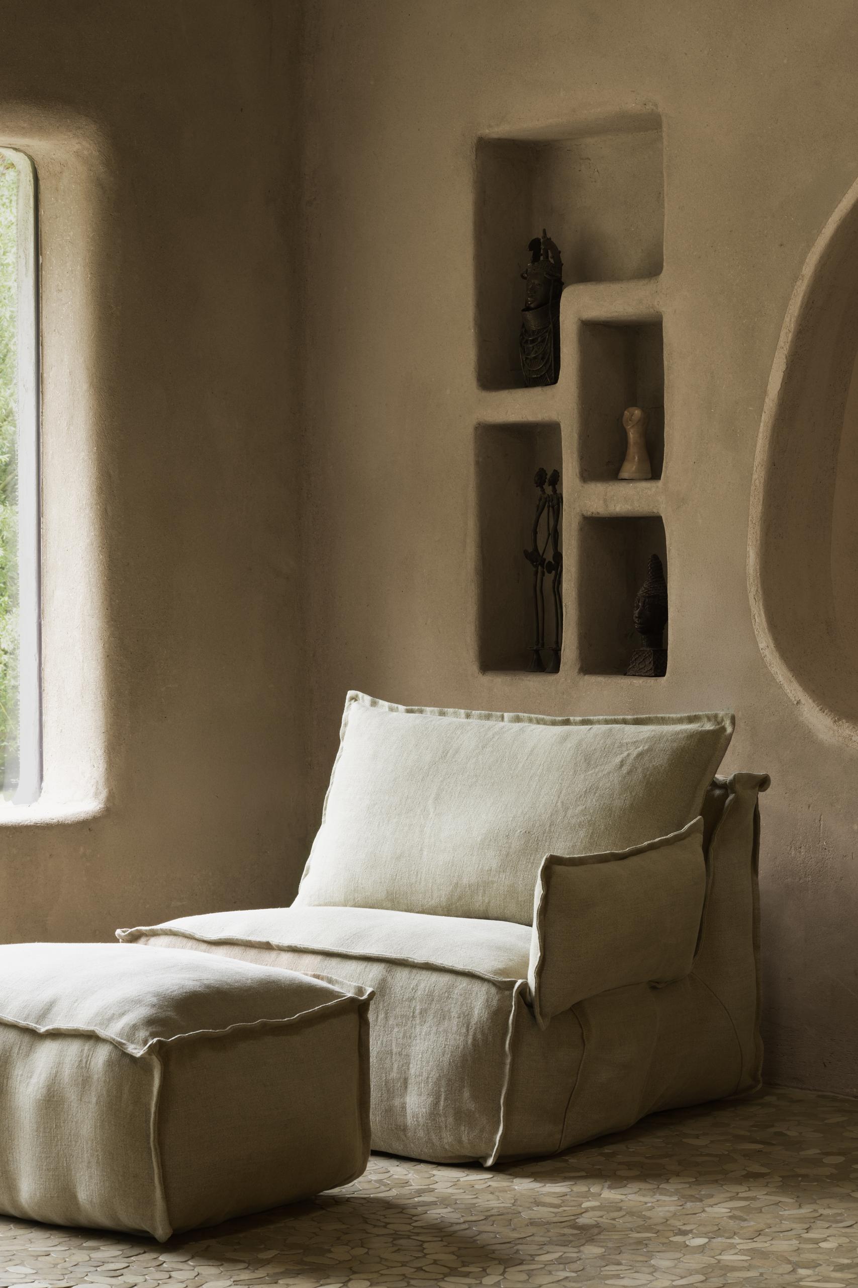 Upholstered in the same soft, breathable linen as the Lounger, they complement the overall look perfectly. Thanks to their clever design, they slide easily into the hidden side pockets of the Lounger – staying neatly in place without interrupting its clean silhouette.