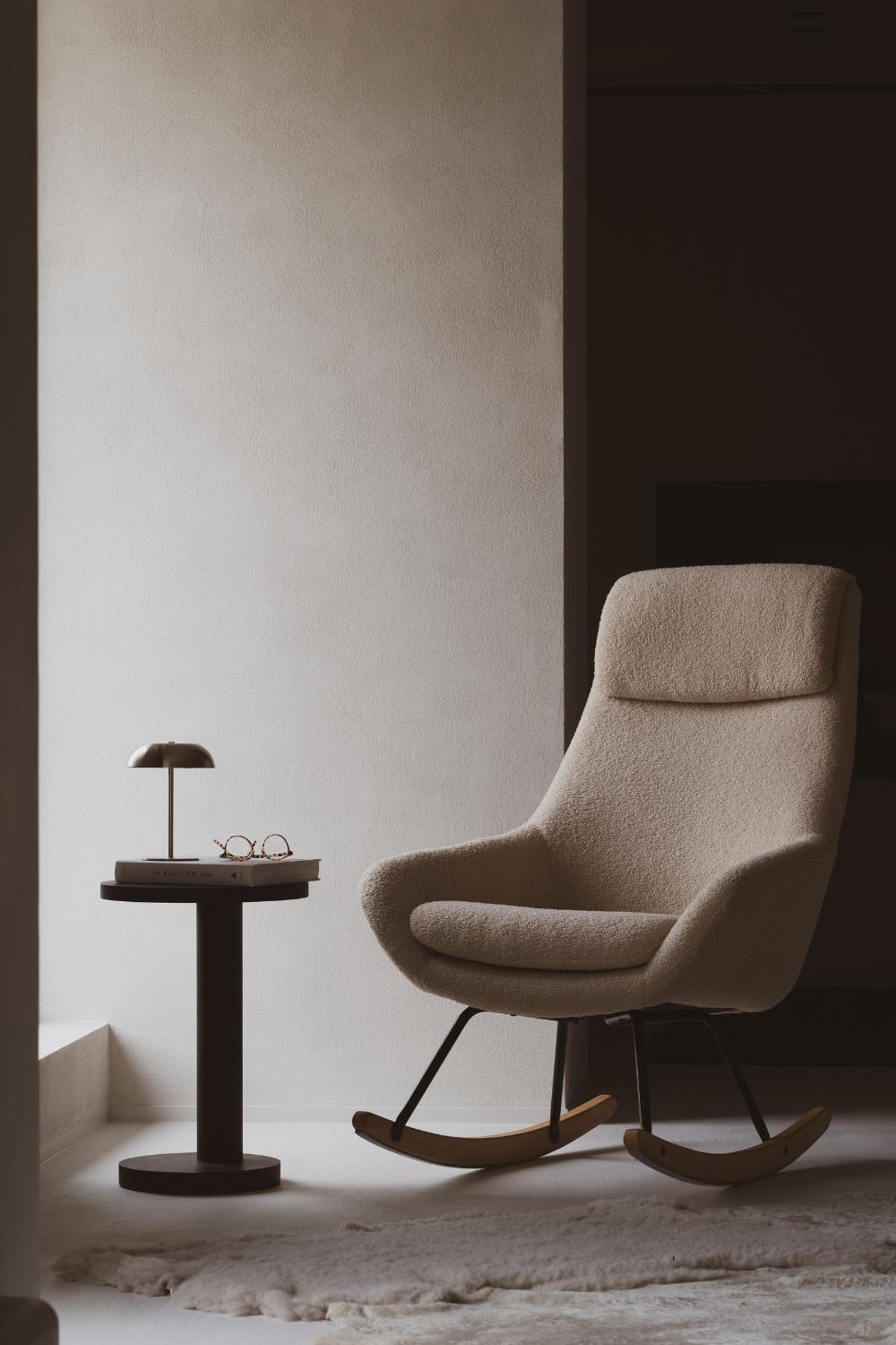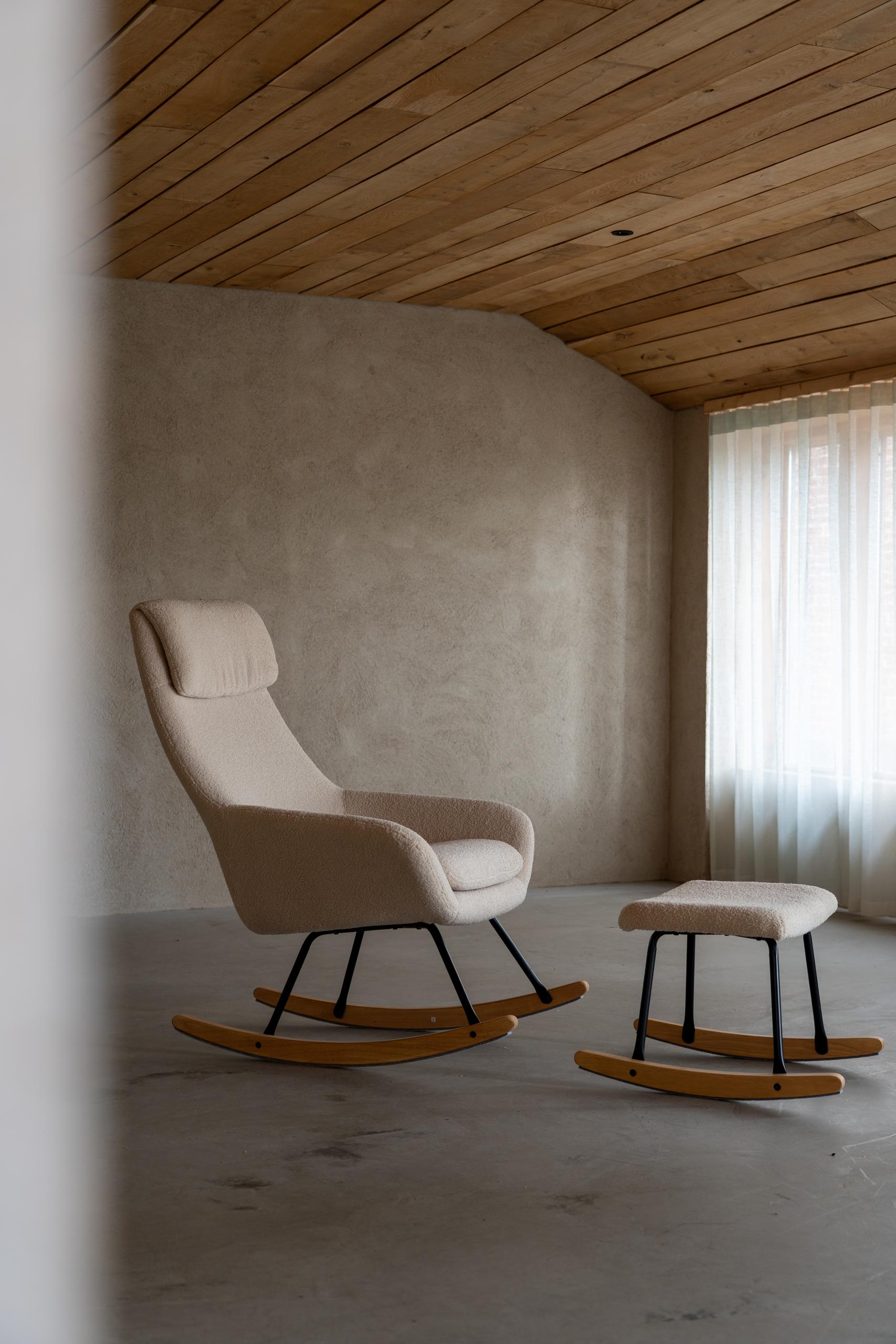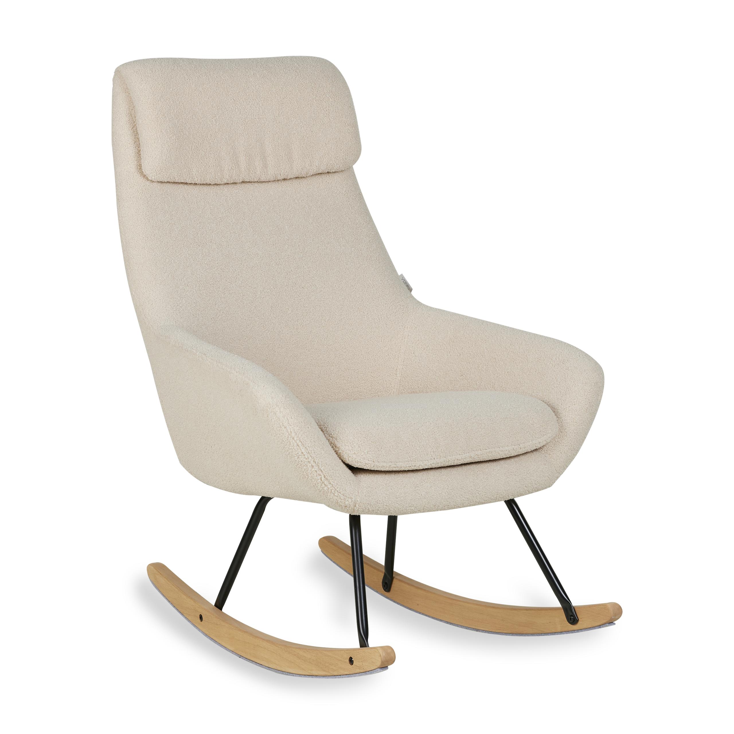 Enhance the charm of your nursery with the Nordic Rocking Chair, where modern design meets lasting comfort for unforgettable moments of connection. This chair rocks effortlessly and features an integrated headrest for optimal comfort. Complete your seating area with the matching hocker (ref. 76 16 CM-H01) and enjoy this stylish addition to your interior.