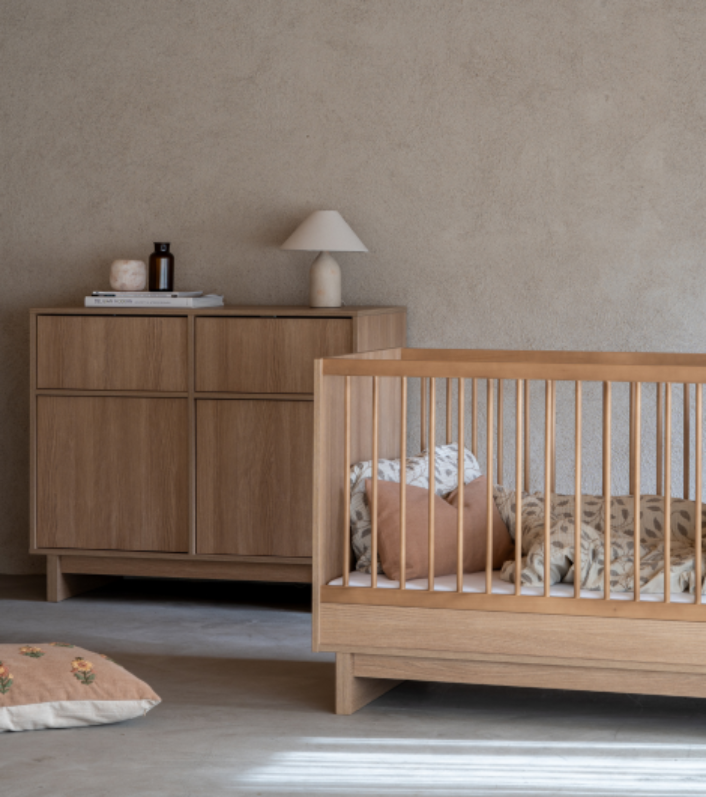 Naast de bedden vind je in de collectie twee formaten commodes: een standaardversie en een XL-variant. Beide zijn compatibel met de XL Extensie, waarmee ze uit te breiden zijn tot een praktische en ruime luiertafel in dezelfde serene stijl. De XL commode kan met een extra opzetstuk zelfs omgevormd worden tot een open boekenkast, ideaal voor boeken en decoratie.